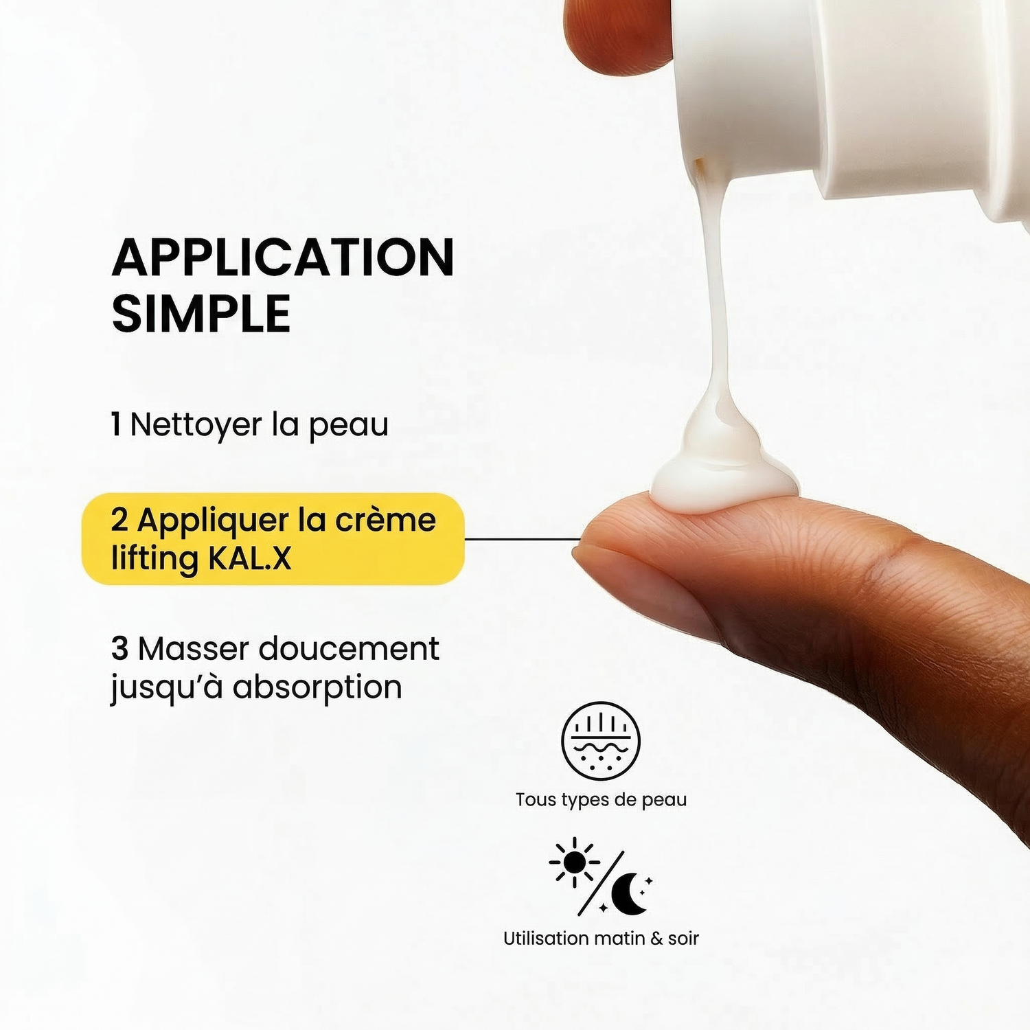 Déposez une noisette de crème sur vos doigts et frottez légèrement pour activer la formule.